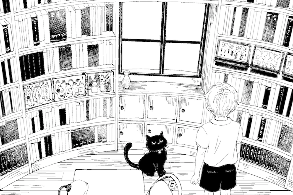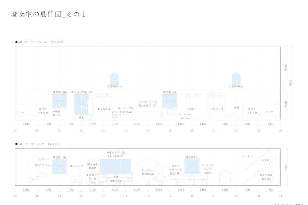 森の中の小さな屋敷を舞台にした魔女と少年の物語。作図の際の背景用建物の作画工程は、一般的にマンガ家による全体構成のスケッチ等のみで決められるが、今回は建築系作図CADを使用して図面化し、精密な3Dモデリングを行うことにより場面ごとにパースを出力している。この方法を採用することにより、人物による目線の高さの違いへの対応や対象の部屋の異なるアングルへの整合性、インテリアの配置替えや模様替えに対しても柔軟に対応できるようになる。