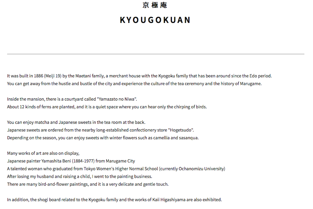 丸亀市西平山にある京極家付きの商家・前谷家のお屋敷「京極庵」のホームページの作成。