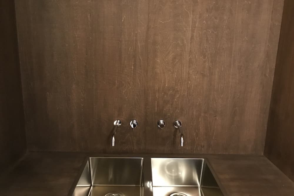 前テナントは宝石屋ということもあり手の込んだ装飾や取り外しのできない什器などがあった。予算の関係もあり、できるだけ現状の建物を改修することなく新たに全く違う内装にするため、2重壁構造とし、建物の中に建物を作るという方法を採用した。