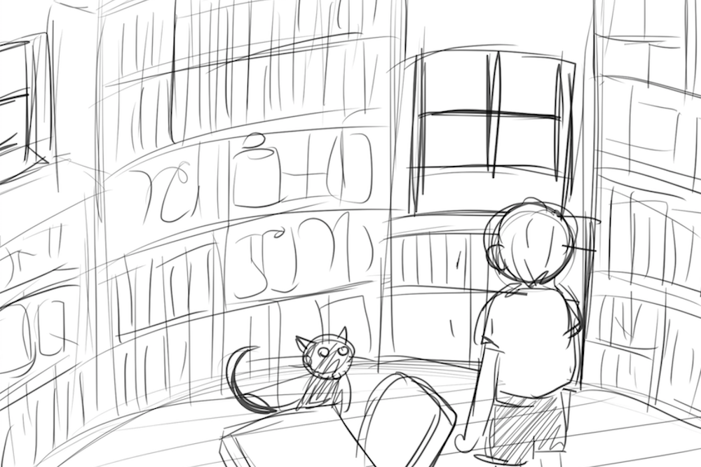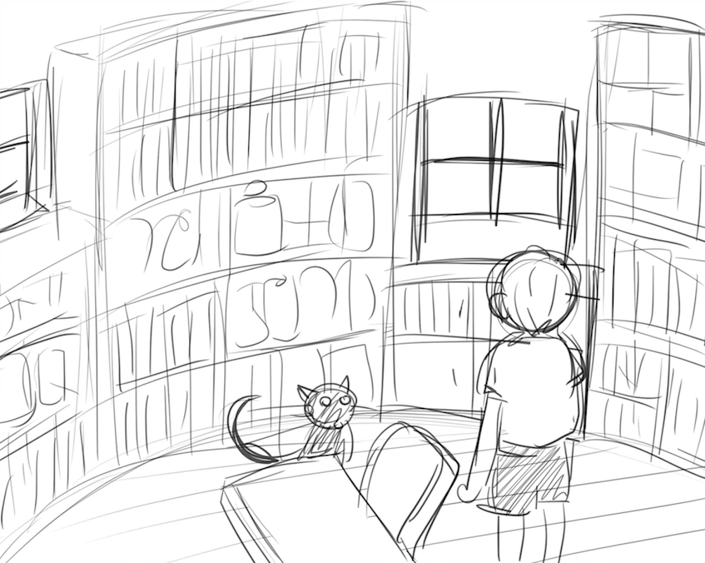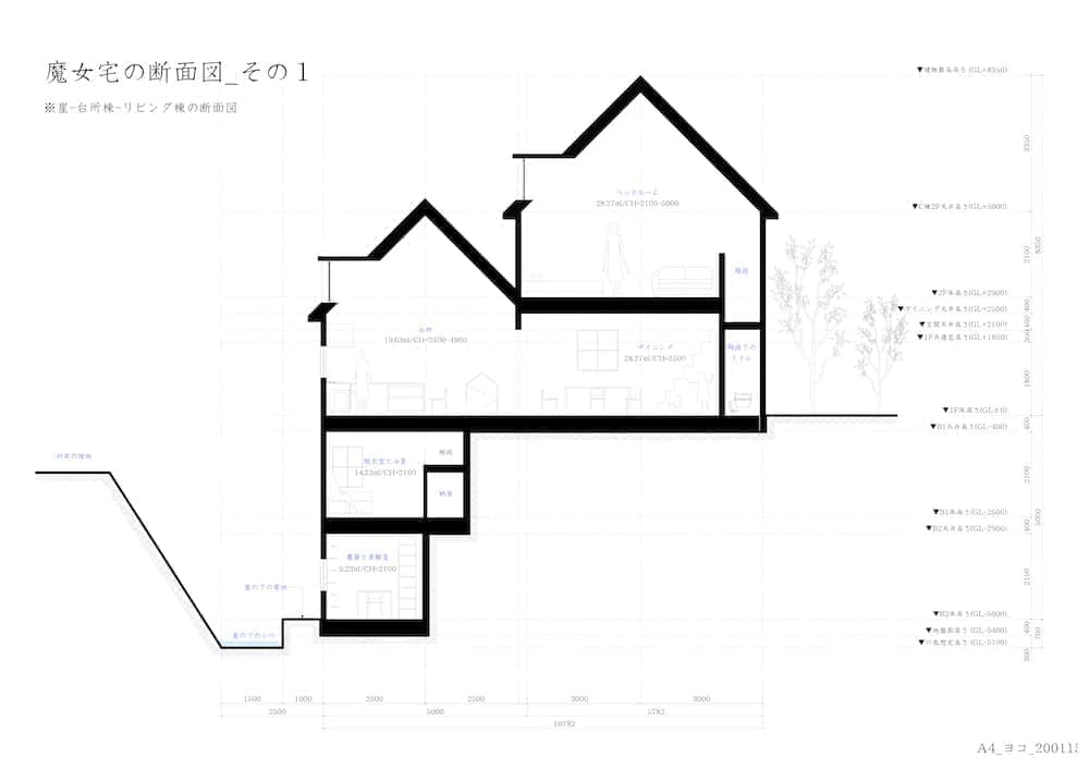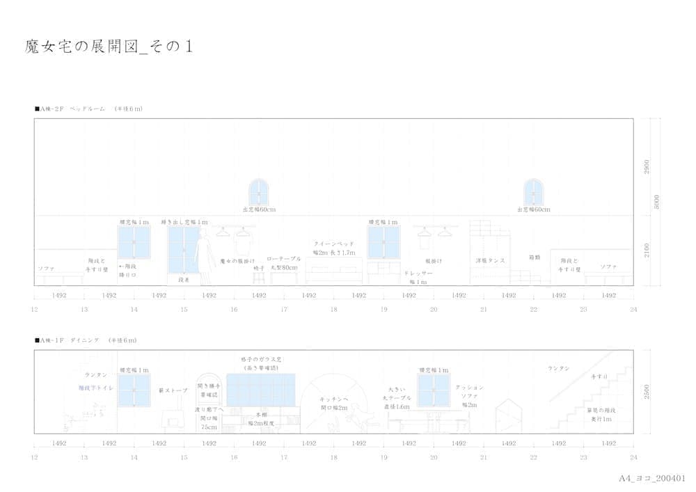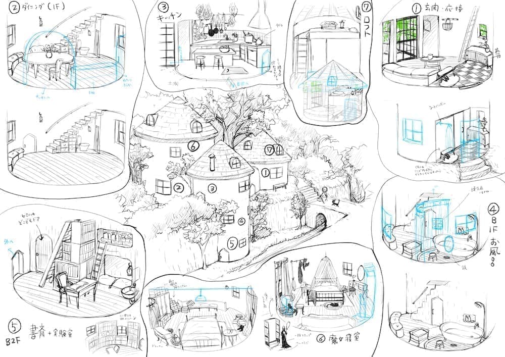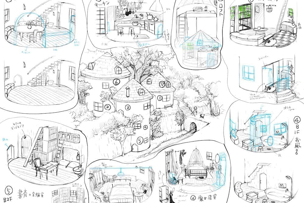 森の中の小さな屋敷を舞台にした魔女と少年の物語。作図の際の背景用建物の作画工程は、一般的にマンガ家による全体構成のスケッチ等のみで決められるが、今回は建築系作図CADを使用して図面化し、精密な3Dモデリングを行うことにより場面ごとにパースを出力している。この方法を採用することにより、人物による目線の高さの違いへの対応や対象の部屋の異なるアングルへの整合性、インテリアの配置替えや模様替えに対しても柔軟に対応できるようになる。