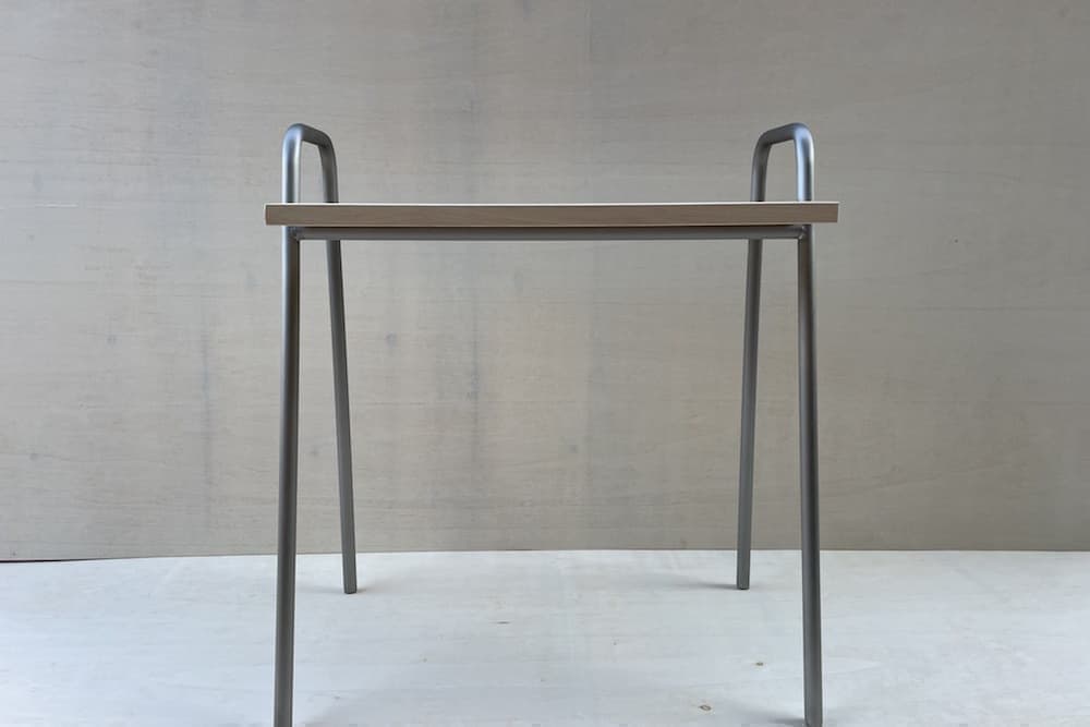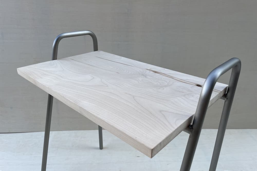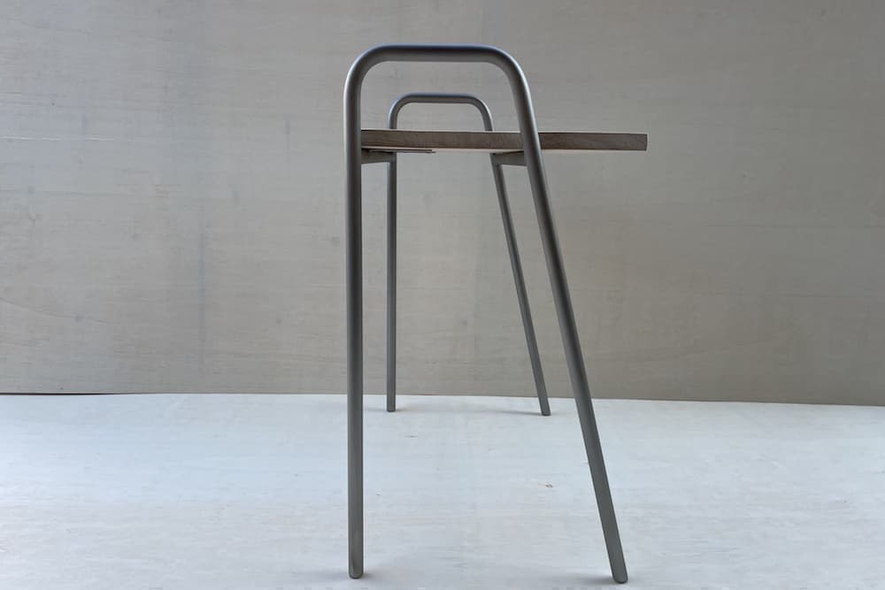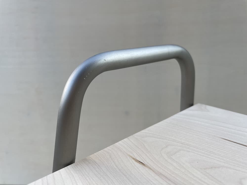 ①sus鋼管タイプは、②steel鋼管の比べて強度は保ちつつかなり軽い仕様になっているので持ち運びが楽であり、日常使いに向いている。また、ヘアライン加工を施すことにより金属特有のテカリもなく、その他の家具や生活へなじみ易い。ただ、①sus鋼管タイプの方が材料費の関係で、②steel鋼管の比べて1.5倍ほどコストがかかる。