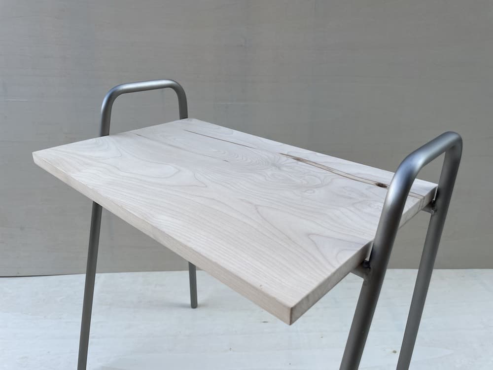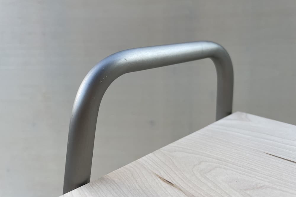躯体:①sus鋼管13. 8 Φヘアライン仕上げ、②steel鋼管13. 8 Φ焼付塗装 | 座面:ホワイトアッシュ無垢材 | 脚端部:溶接留め