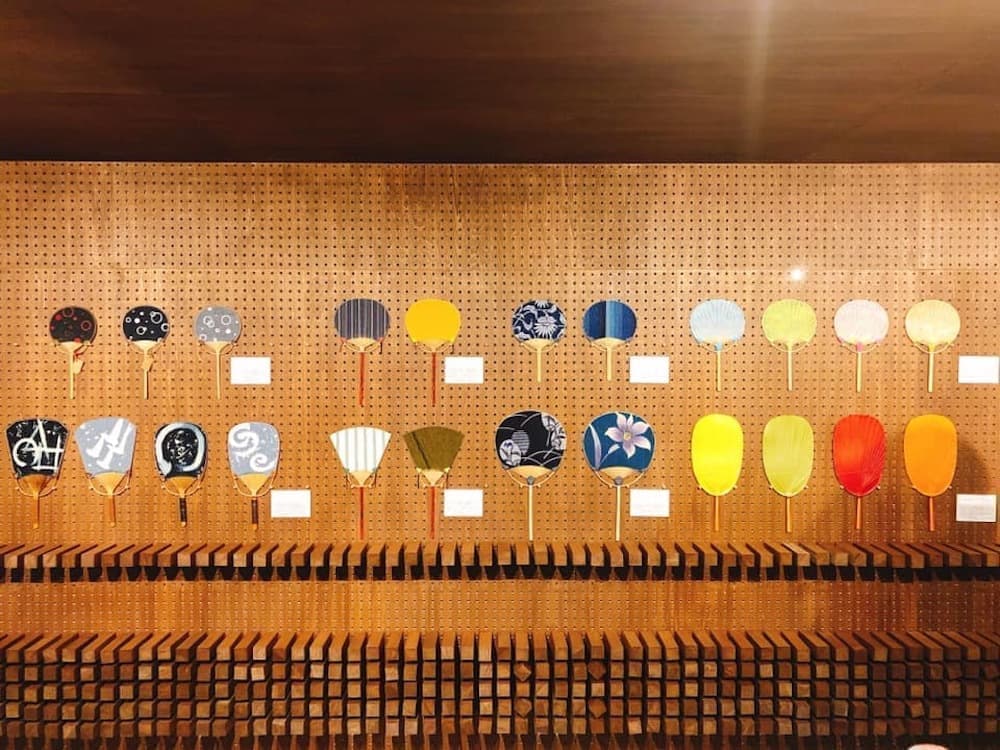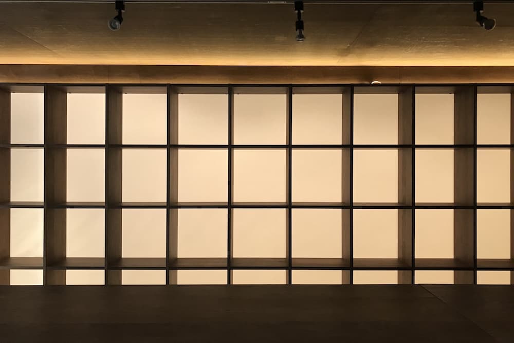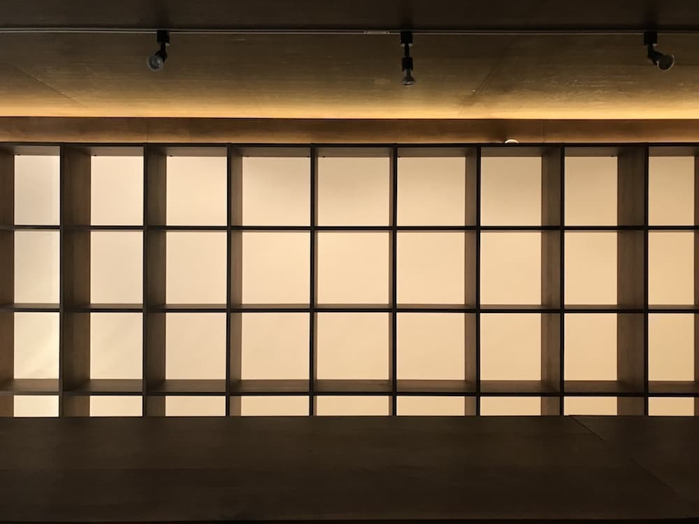 展示棚は、南北に向かい合った2面あり、北側は8mm穴の有孔ボードに15cmの長さのスティックを約4000本刺すことにより、棚の機能と壁の装飾の機能を持たせている。またスティックは取り外し、設置ができるので展示する物の大きさなどに柔軟に対応できる。南側の展示棚は既製品の格子棚を店舗の端から端までできるだけ長く設置し、背面に障子紙を貼ることによって事務所側からの光が透過する仕組みになっている。