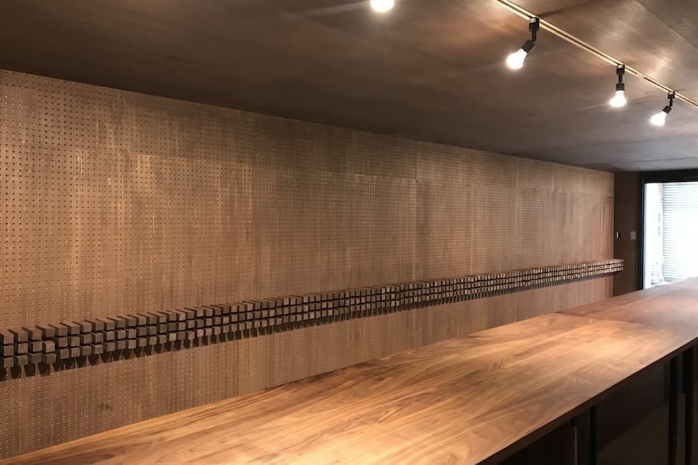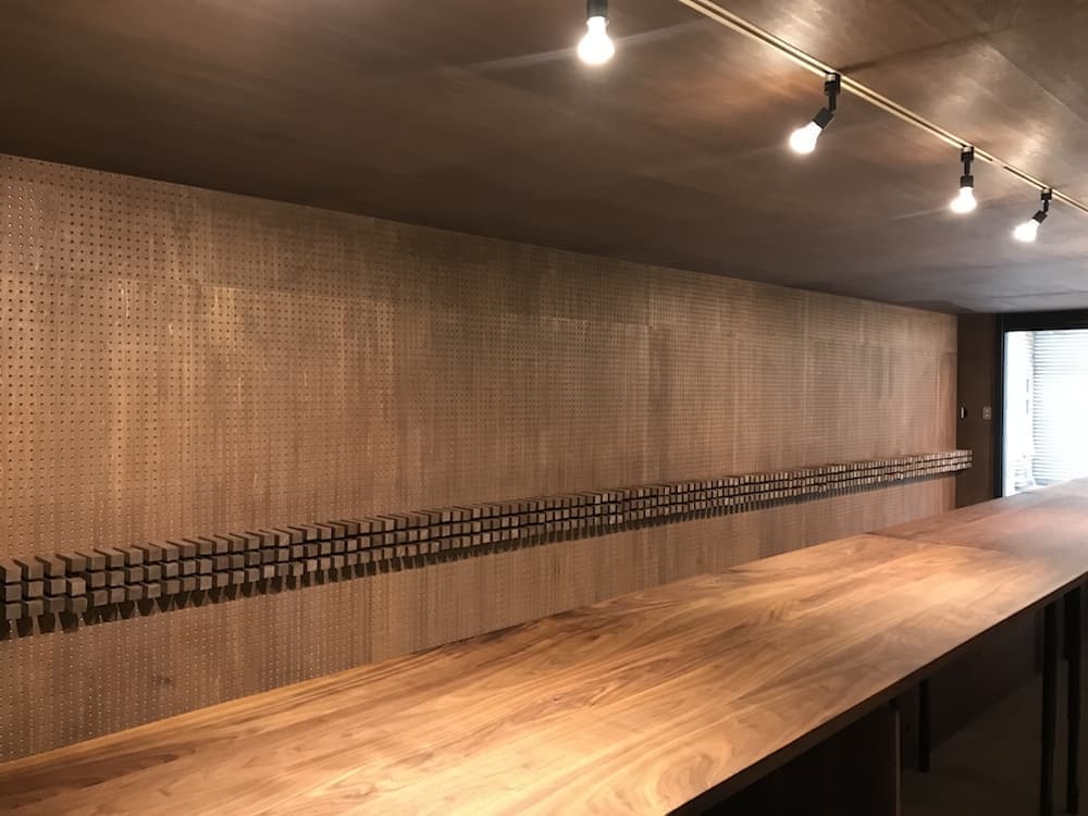 前テナントは宝石屋ということもあり手の込んだ装飾や取り外しのできない什器などがあった。予算の関係もあり、できるだけ現状の建物を改修することなく新たに全く違う内装にするため、2重壁構造とし、建物の中に建物を作るという方法を採用した。