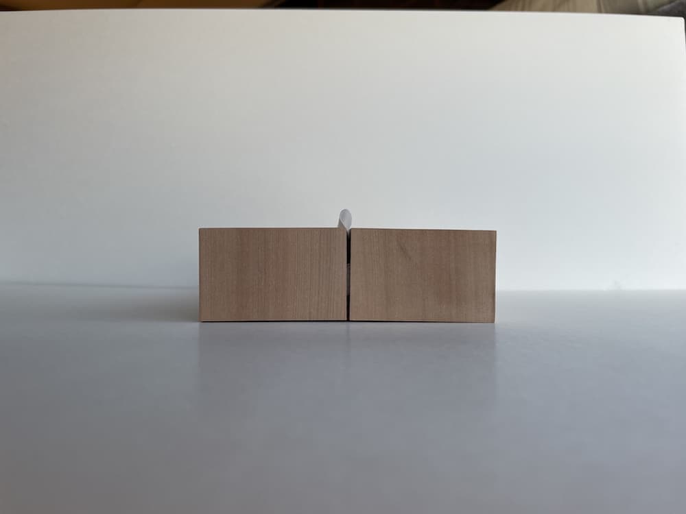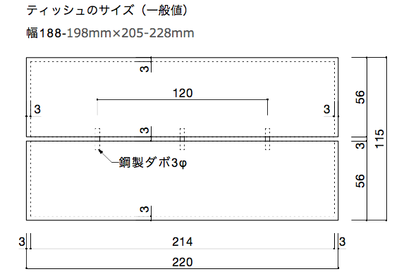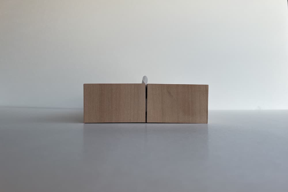 まず、既製品のティッシュ箱の見慣れた形状(ボリューム)から、わざと各寸法を変化させた。ティッシュ箱の形状はものとしての力が強いので、寸法を調整することでかなり「ティッシュ箱感」から離脱できた。